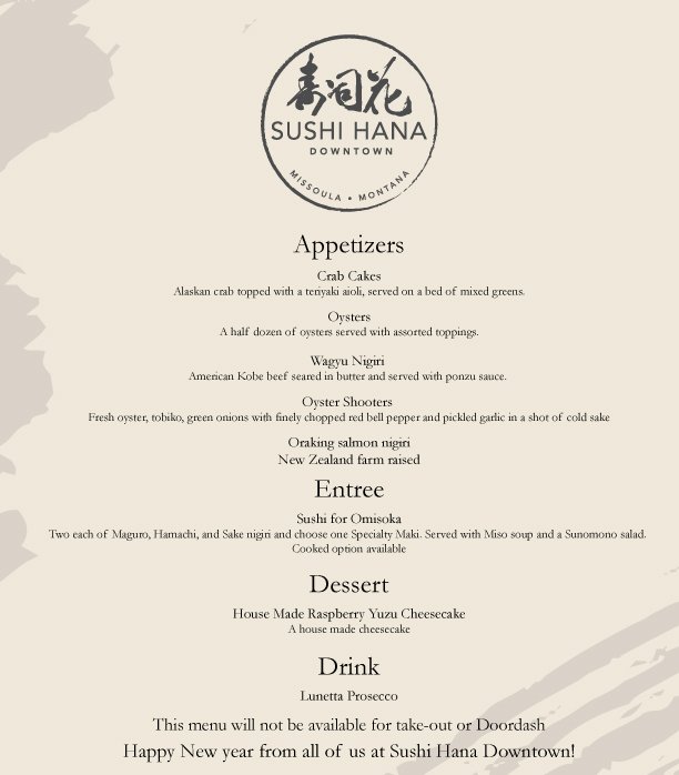 Hi everyone! It’s that time of the year again, here’s our menu for our annual New Year’s Eve dinner. We will not be offering this menu for take-out/DoorDash. Happy Holidays from all of us at Sushi Hana Downtown!
